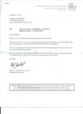 So I downloaded the form they supplied, filled out about six sheets with what I knew of the men I wanted to look at and sent it off to the National Personnel Records Center 1 Archives Drive in St Louis, Missouri. Flash to about 3 weeks later, I received several emails from the man preforming the searches for me. Each was a short letter about how this man wasn't in the military or this man was in from 1942 to 1946 or the like. Talk about being disappointed!!! Ok so, if these six, who were close to my BM in age were not there, it must be another brother. I filled out i think 8 more forms, not regarding age (unless there was a boy maybe 10 in 1953 ) and sent them off. Surely......but alas, this time I waited about 6 weeks, almost forgetting I had sent them off. Here is one of the "REJECTION" letters. At least that is how I felt!!